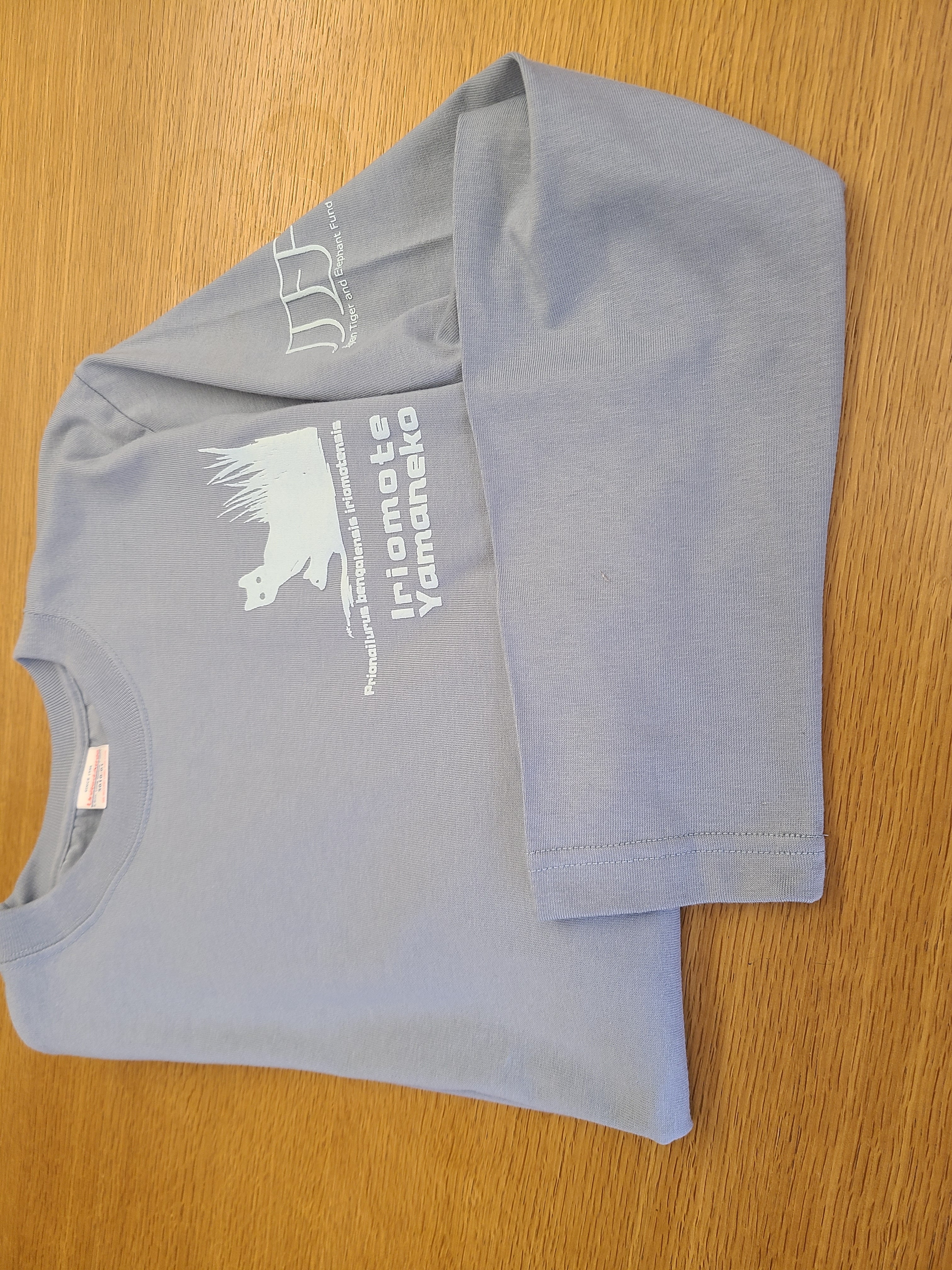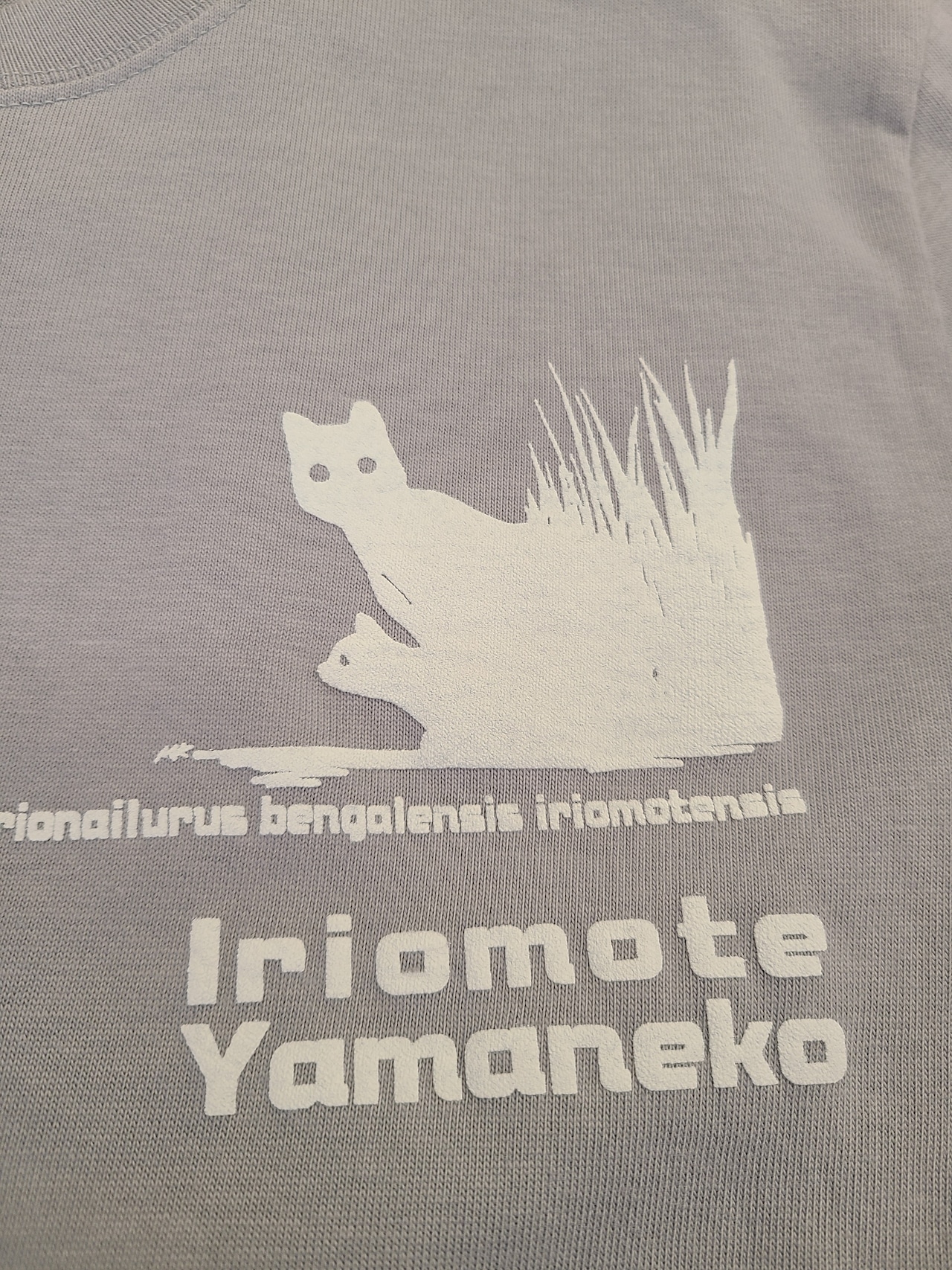 草むらからこっそりと顔を出しているイリオモテヤマネコの親子のシルエットが、見る人を魅了します。ラバープリントで施されたこのデザインは、少し盛り上がりを持ち、立体感があります。袖に、JTEFとワンポイントが。
