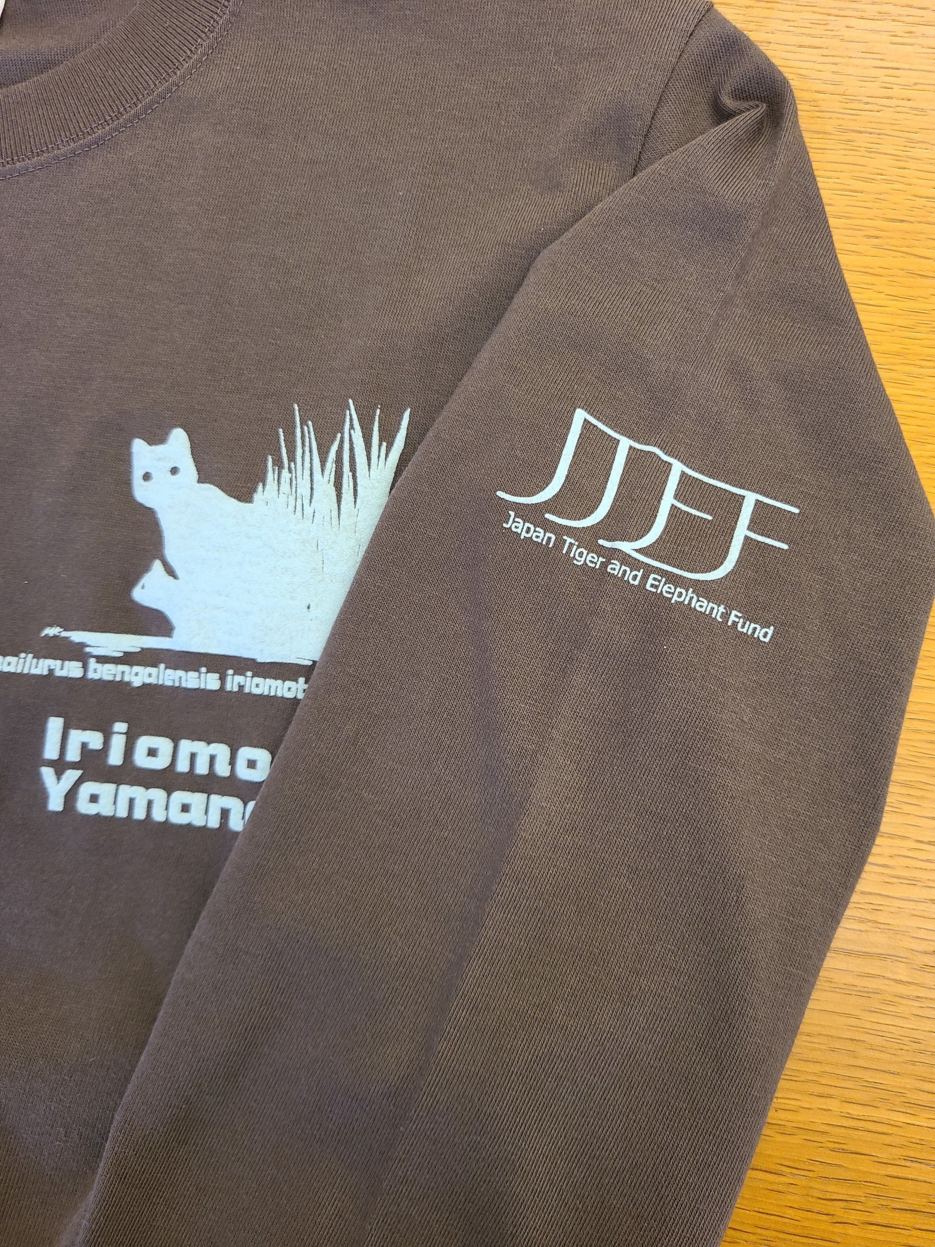 チャコールグレーのバックグラウンドで草むらからこっそりと顔を出しているイリオモテヤマネコの親子のシルエットが、見る人を魅了します。ライトブルーのラバープリントで施されたこのデザインは、少し盛り上がりを持ち、立体感があります。袖に、JTEFとワンポイントが。
